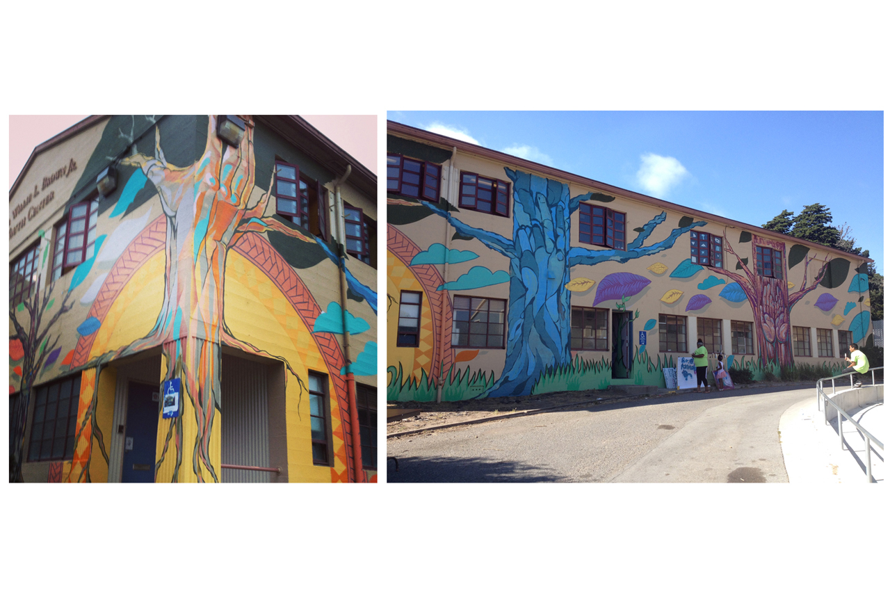 The title for the tile mural is West Oakland Roots: Loyal to My Soil, composed of a total of nine panels. The main and central panel is located at the entrance of the building facing Market Street. It is a an evolving mask to tell the cultural history, specifically of the African-American and Latino diasporas, of the West Oakland community. The mask closes in the center with a portrait of a young woman who is a member of the Attitudinal Healing Center and also Amana Harris' daughter. Amana Harris is AHC's Associate Director. In the panel located in 33rd Street, Daniel, a youth leader of AHC is depicted hitting a drum. Mindful drumming is a practice conducted inside AHC to explore the healing art of rhythms and sounds as it connects to community building. Two large hands lay below him in the posture of a "dap", the knocking of two fists together to symbolize, agreement, unity and respect. The final design was painted by Juana Aliicia Ariaza and the Trust Your Struggle artist collective, digitized and sent off to Digital Ceramics in the United Kingdom to be manufactured in ceramic tiles. Final installation of the tiles was completed by Yes Construction, a City of Oakland vendor, on February 2014.