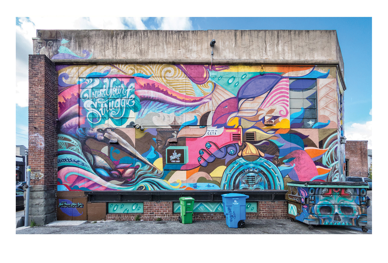 Oakland/Berkeley based muralist Miguel "Bounce" Perez explores the intersection between where life meets commerce. This is the intersection of modern advancement with cycles of displacement. Amidst the influx of wealth, the city is losing it's social capital. YBCA sits on the cross-section of SOMA, the Tenderloin and the Financial District. This locality has transformed from industrial, to commercial, to Mega-city. Lost in the midst of progress are the hardworking San Franciscans, who have enriched the city with their passions and cultural diversity. They are the inspiration for the mural. Those who have built the vibrancy of the city, attracting millions every year, now cling to their ability to interact with the city they actualized. The Trust Your Struggle mural is a celebration of San Francisco's quintessential characteristics. It is a work to inspire hope and perseverance through the struggles of transformation. It celebrates belief in our communities' collective dreams and in individual fortitude.